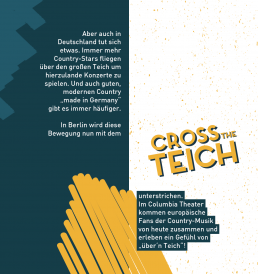 I was responsible for the concept, design, and management of the Cross the Teich campaign — a mini festival in Berlin with the mission to bring country music to German stages. The goal was to create a fresh, contemporary brand identity for the event that reimagined the genre’s visual language and challenged traditional “cowboy clichés.”